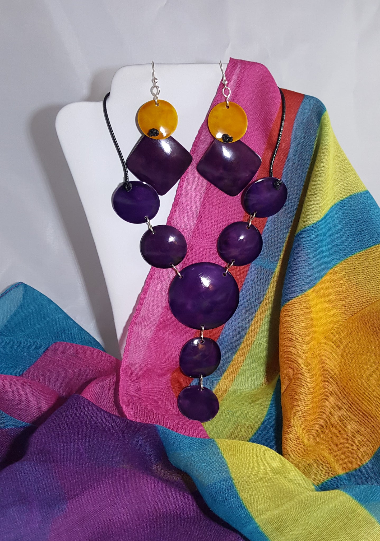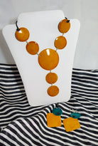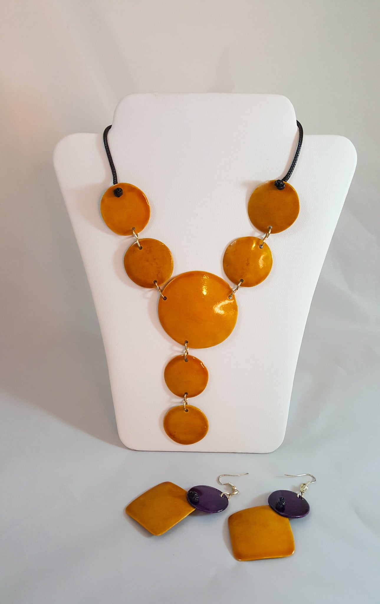Crafted with wood, pumpkin shell, silk cording, metal findings.