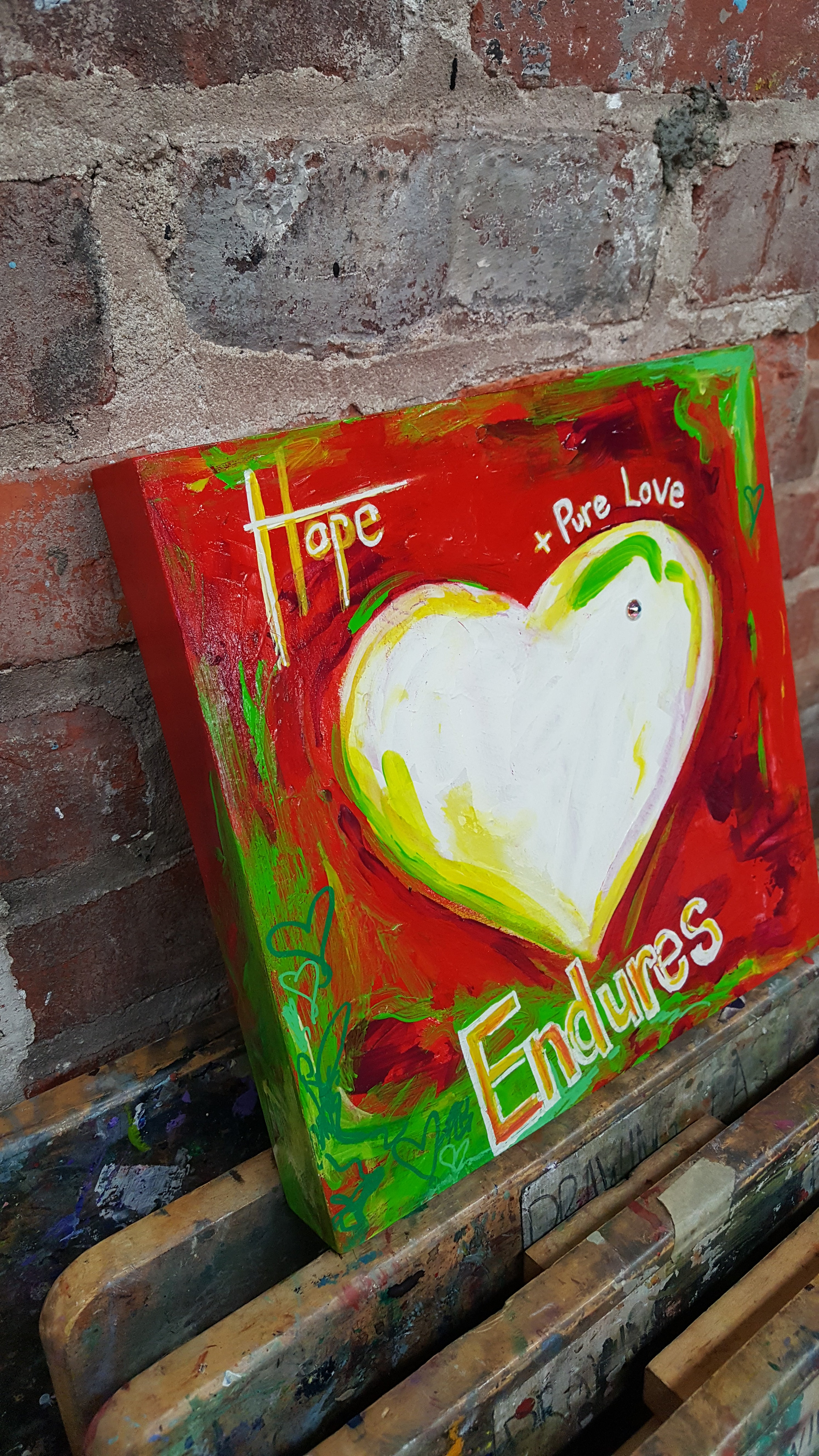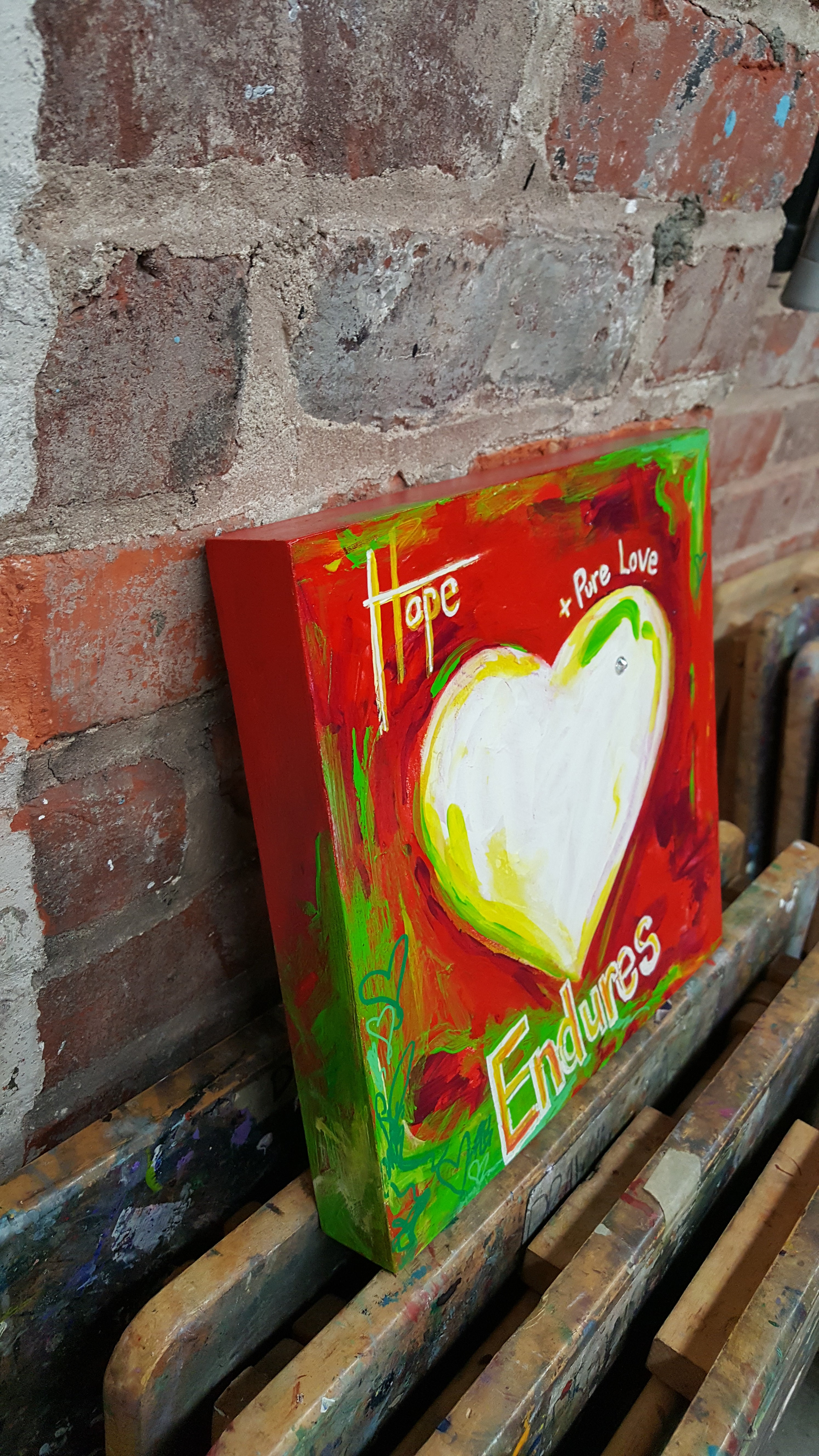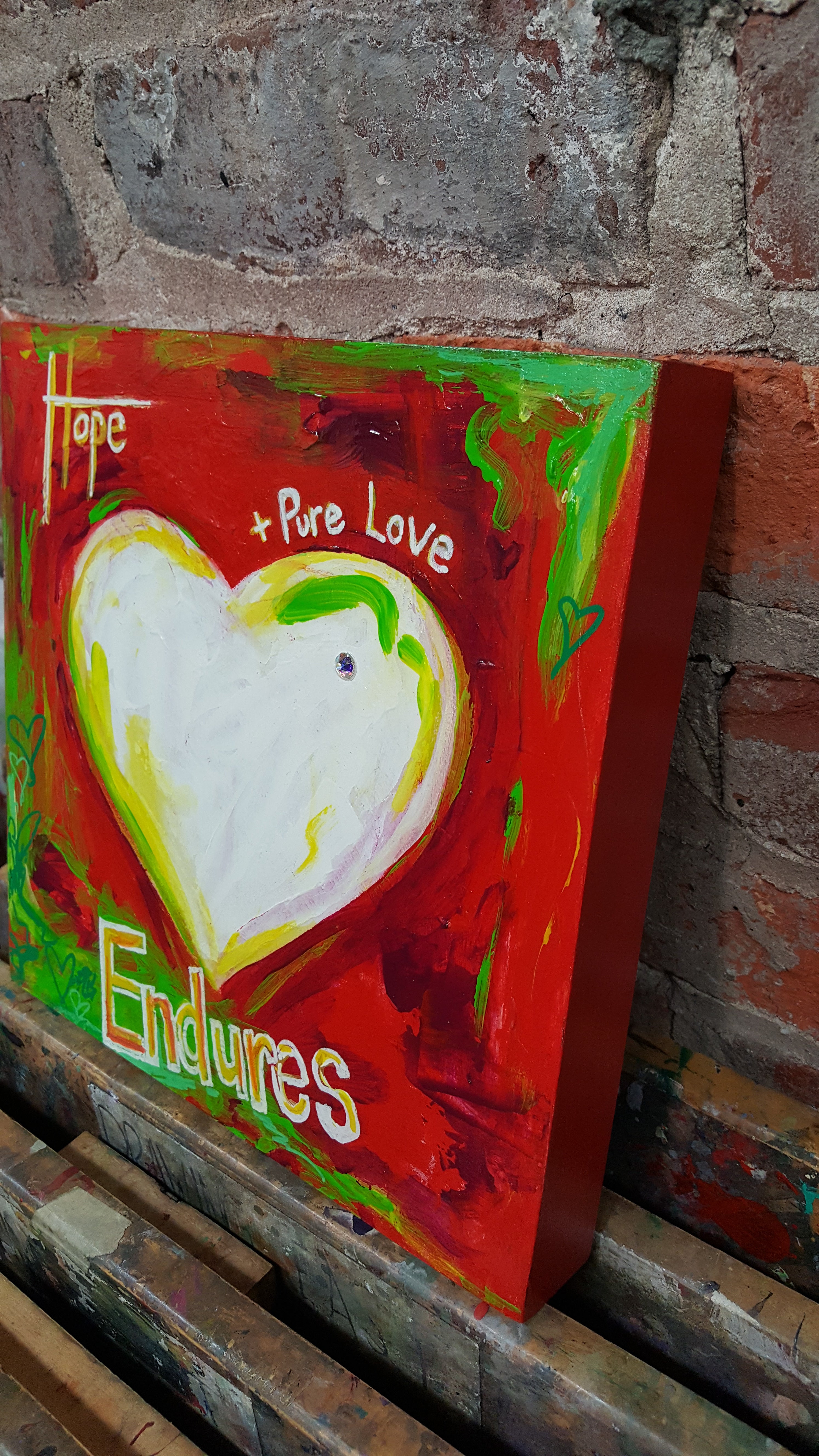 The artwork is painted on 10 x10 birchwood panels using acrylic paint, professional grade paste, and gel. Each heart represents the different ways in which the human spirit loves.