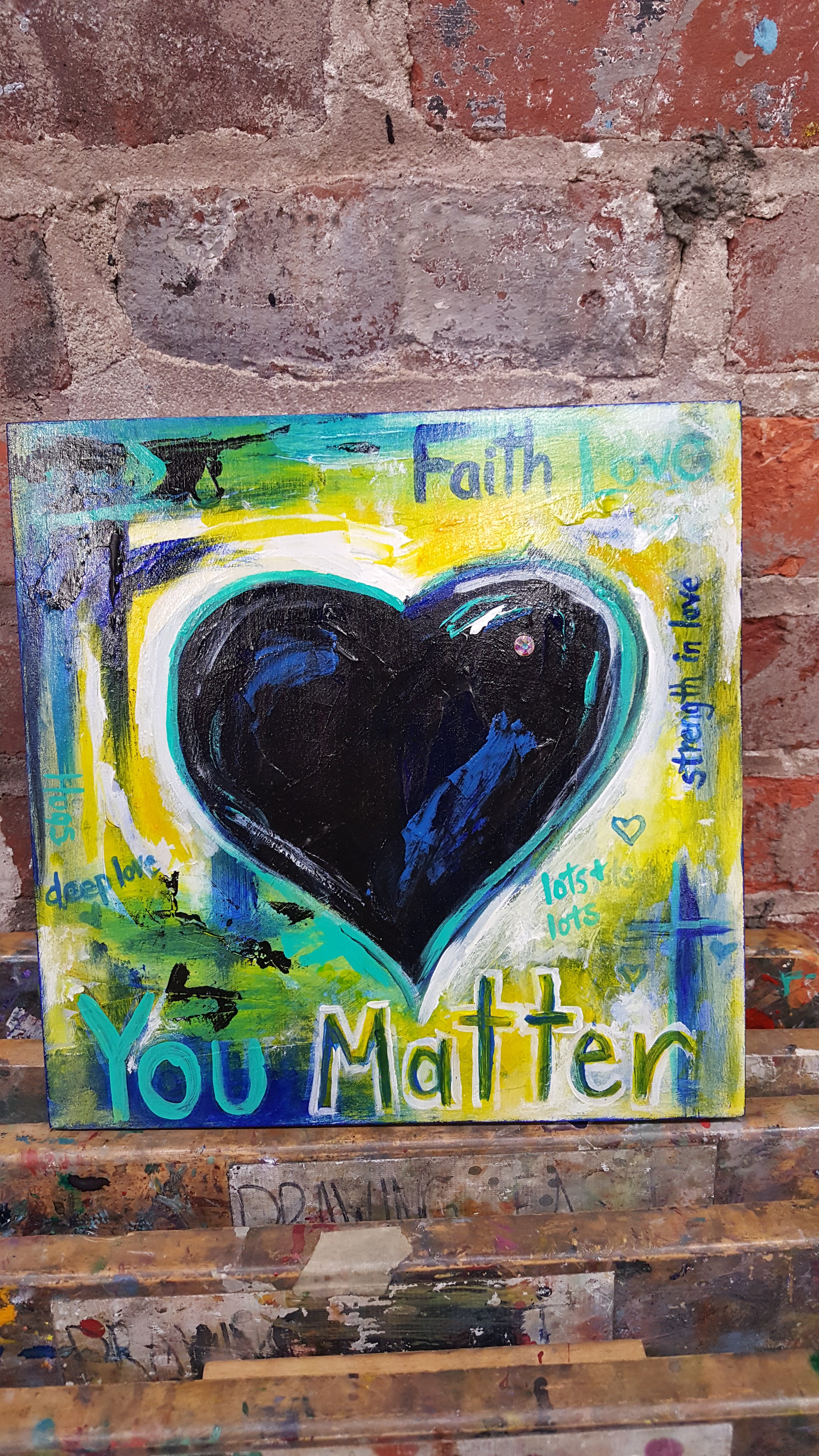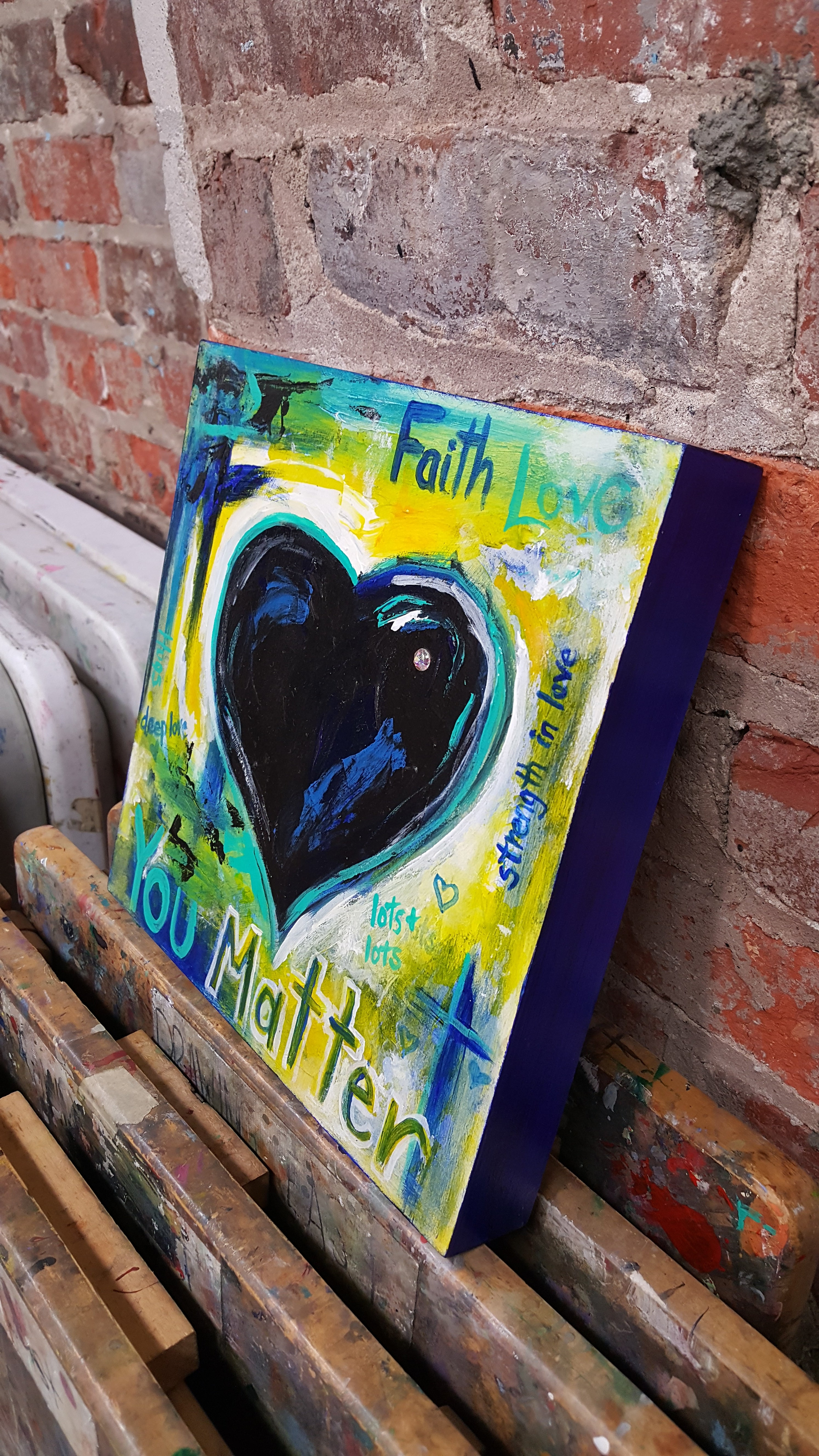The artwork is painted on 10 x10 birchwood panels using acrylic paint, professional grade paste, and gel. Each heart represents the different ways in which the human spirit loves.